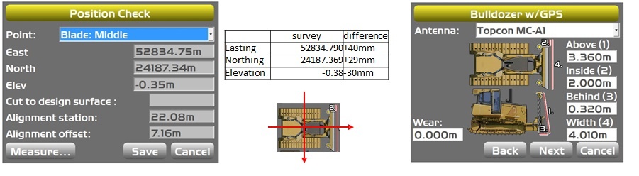In this example we have orientated the machine North and checked the centre mast position ( TOOLS-POSITION CHECK)which has given us the errors shown in the table. To adjust the machine file to remove these errors, go to CONTROL- MACHINE SETUP-EDIT and press next until you reach the measurement screen for the centre mast. As the machine blade is facing North/ East we simply need to adjust the measurements for Above (Elevation), Inside (Easting) and Behind (Northing).