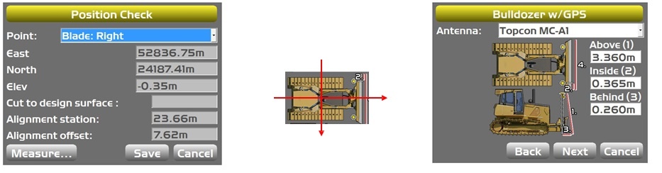 In order to carry out a position check in the correct method it must be noted that the Topcon system is based on having the Main antenna based at the centre of the blade. This means that the orientation of the blade revolves around the centre mast, so it is this position which we must check first in order to fix the pivot point position. Once this is achieved minor adjustments to the right hand mast will also correct the left hand side.